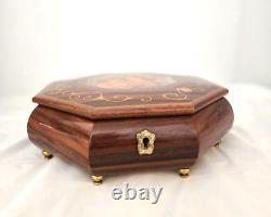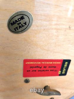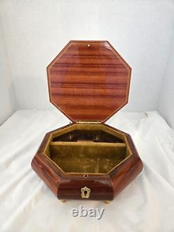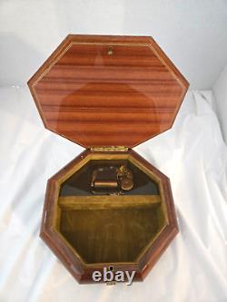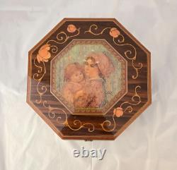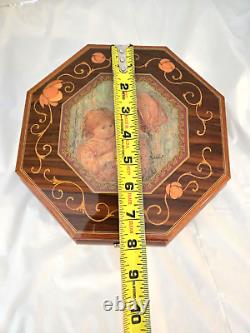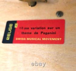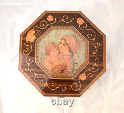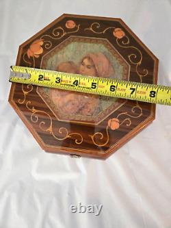 Beautiful and Rare, Lacquered Reuge Music Jewelry Box Plays Theme De Paganini. This octagonal lacquered Reuge music jewelry box is a rare find that plays the beautiful theme of Paganini. The cover is adorned with a copy of a Edna Hibel Mother and Child portrait. The intricate design and quality construction make it a perfect addition to any collection of decorative collectibles. The box is made by Reuge, a renowned brand known for their exceptional quality in music boxes.