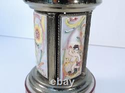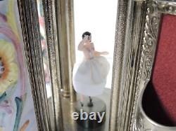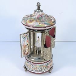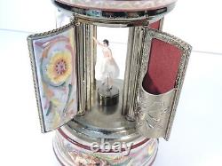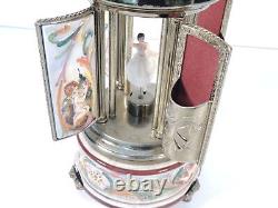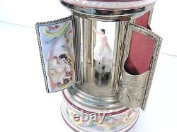 Measures: 11" Tall x 5" wide. Music plays and dancer in center dances/spins. Good condition- has some light wear from previously being displayed. Found 2 tiny knicks around rim of top part of carousel. Some tarnishing of metal part.