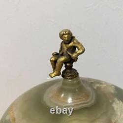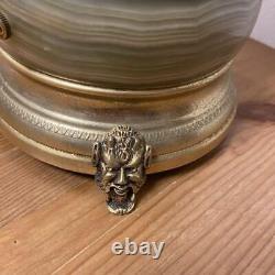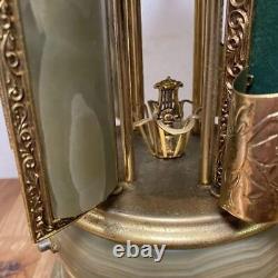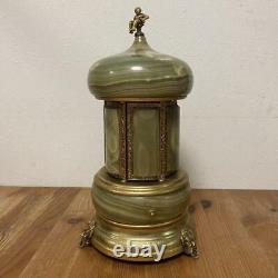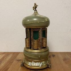 Reuge Music Box Carousel Cigarette Holder w/ Swiss Movement - Made in Italy. This vintage Reuge music box plays the tune "Lala's Theme" from Love Story and doubles as a carousel cigarette holder. Expertly crafted in Italy, it features a Swiss music movement and a central harp figure designed to elegantly hold cigarettes. The music box is fully functional and continues to play the tune.
