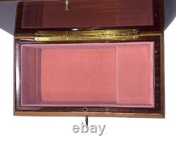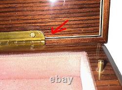 However it's only in the clear finish and not the wood. The wood seems to be flaw free. Gorgeous enamel/laquer floral motif, pink velvet interior, and a sweet windup melody of "Memory" from Cats. Measures; 11"x 6" x 3. Reuge Swiss musical movement, San Francisco music box company.
