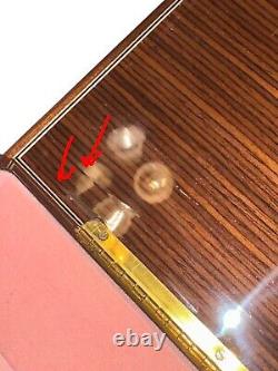 This wood music box is amazing. In good condition with some flaws in the thick glossy finish as pointed out with the red arrows. The cracks in the finish are on the inside and on the bottom side.