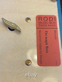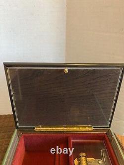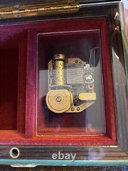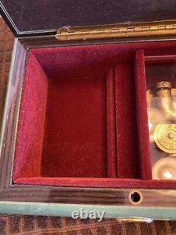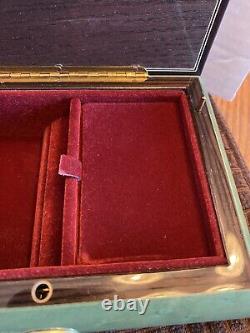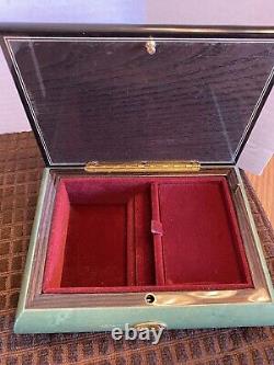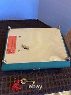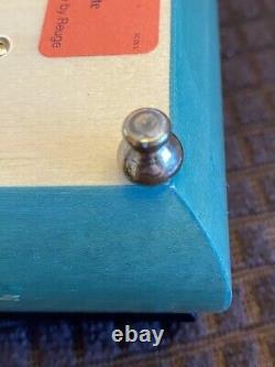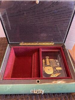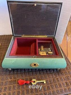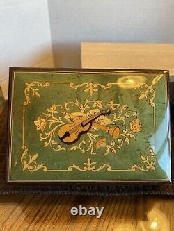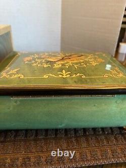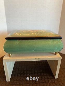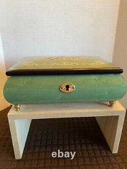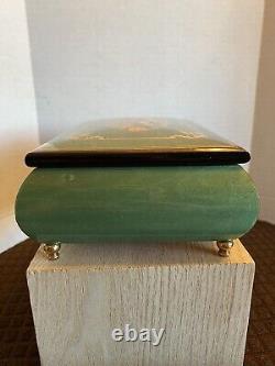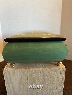 Beautiful handcrafted mint green wood inlay music themed music box. Plays " The Magic Flute" movement in music box by Reuge. Pictures a violin, horn and sheet music.