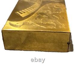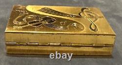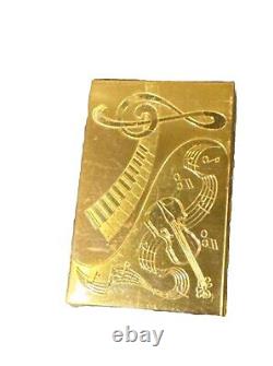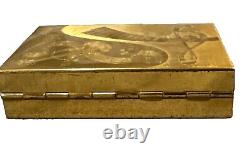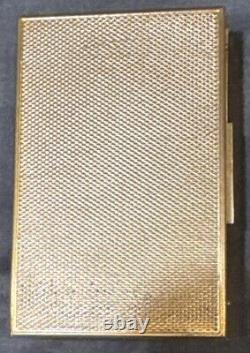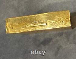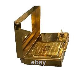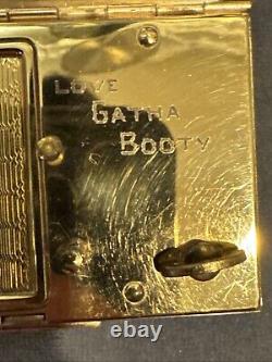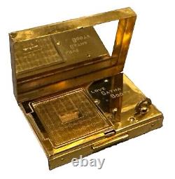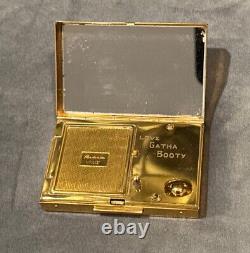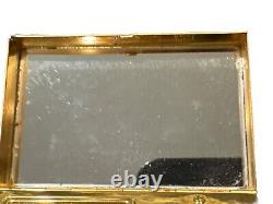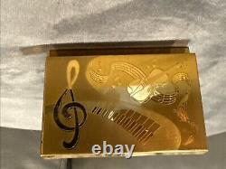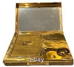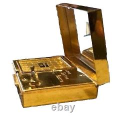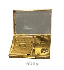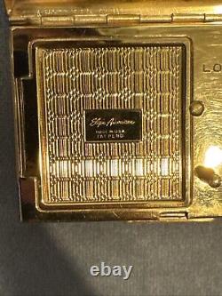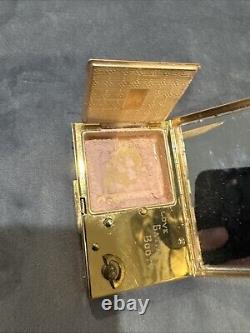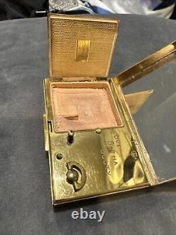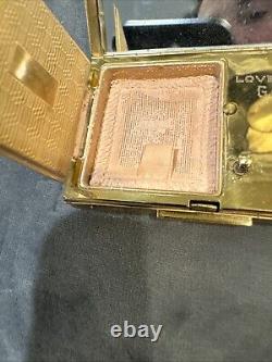Approximate size: 3" x 2" x 0.5 NP#A104. Elgin American Gold Compact with Swiss Music Box, Case is USA Made, Plays Brahms Waltz, Powder and Mirror, 3.75" wide x 1.75" tall.