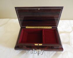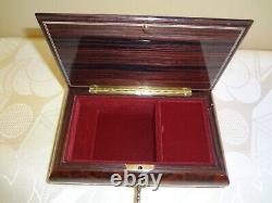 VTG Romance Reuge Swiss Musical Movement Italian Inlaid Brown Wood Box Jewelry Box # 496. Plays "The Blue Danube" by Johann Strauss. Accented with brass pedestal feet for sophistication and non-scratch functionality. If you lift interior panel protector, you can watch the musical movement. Win-up, turn key style mechanism. Beautiful, natural burl-elm and rosewood wood smooth finish with hand crafted inlay design. Violin centerpiece against a music theme background. Interior lined with red soft velvet. Measures approximately: 7.5" x 4.25" (at the top) x 2.5 High. Smoke and pet free home. I try my best to describe every item accurately, but occasionally I can miss something. If this happens, please contact me before leaving feedback and I will take care of it. Thanks for looking at my items.